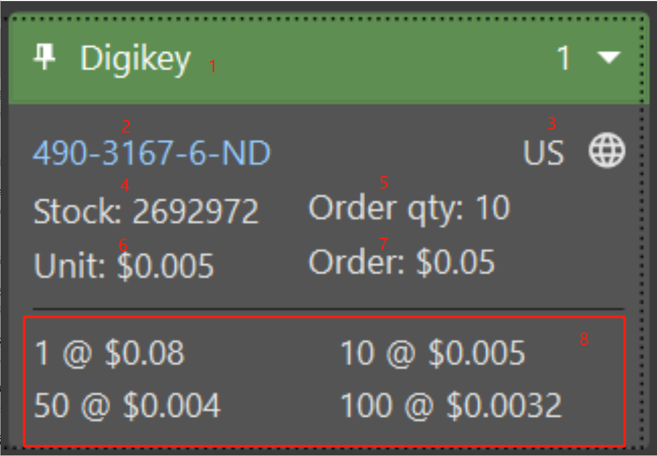 供應商元件號根據可用性和價格自動排序。每個供應商元件號抬頭包含一塊彩色的橫幅,顏色反映與選擇供應商元件號相關的風險(下文有詳細說明)。因為可用性和價格數據可從Altium Parts Provider隨時刷新,供應商元件號抬頭的順序可能發生變化。