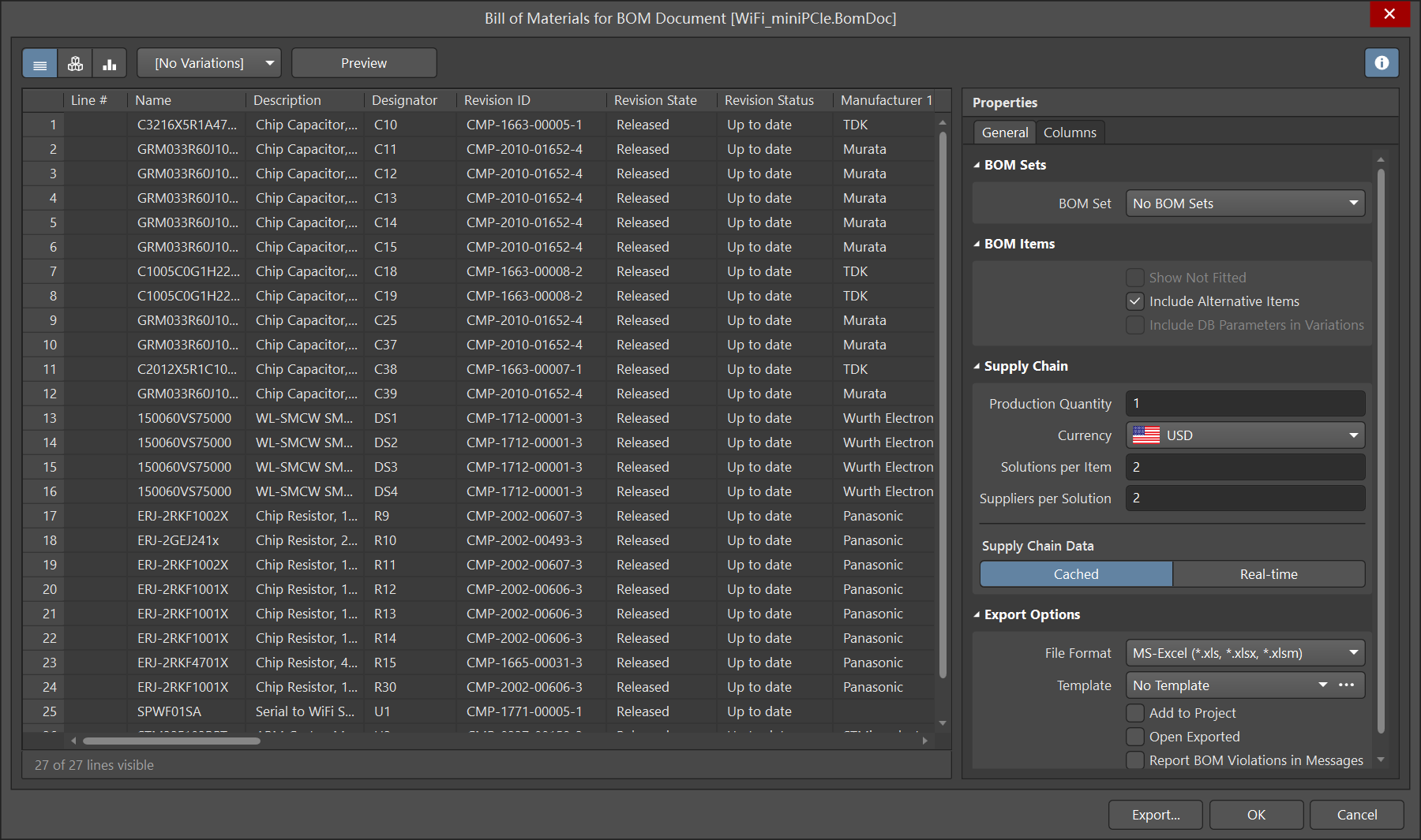 這種將供應鏈詳細信息直接輸入BOM中的功能改變了BOM文檔在PCB項目中的作用。不再只是簡單的輸出文件,ActiveBOM提供了元器件管理過程,使其與原理圖設計和PCB設計過程同時進行,其中ActiveBOM的Bom文檔成為了PCB項目所有BOM數據的來源并應用于所有BOM類型的輸出。