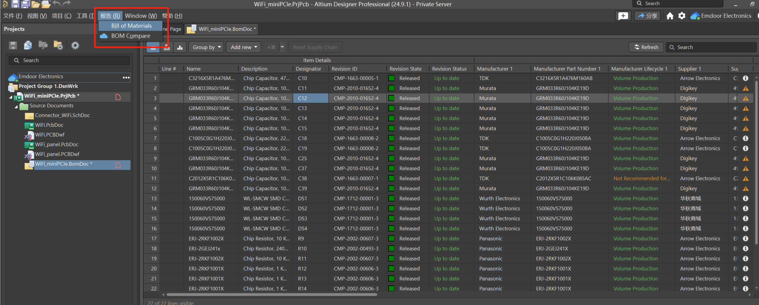 零部件在設計版本之間發生變化的情況并不少見。為了確保正確完成該過程,許多設計人員喜歡將當前項目的 BOM 與項目先前修訂的 BOM 進行比較。如果項目是工作區項目并包含ActiveBOM BOM文檔,這可以使用 BOM Compare 功能來完成。