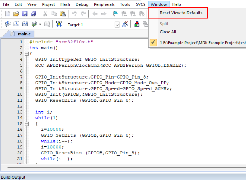 啟動Keil后,通過頂部菜單欄依次選擇:Window → Reset View to Defaults