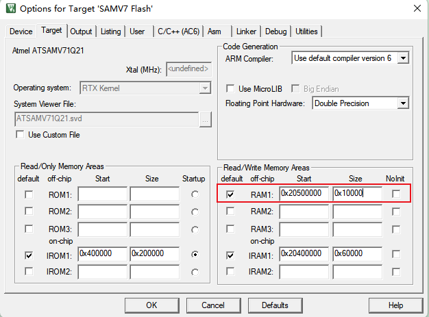 1)、首先,需要在Options->Target中去規劃出一個內存地址(如圖4-1),在Read/write Memory Areas中的RAM1中去設置內存的起始地址和內存的大小。并且勾選上前面的default。