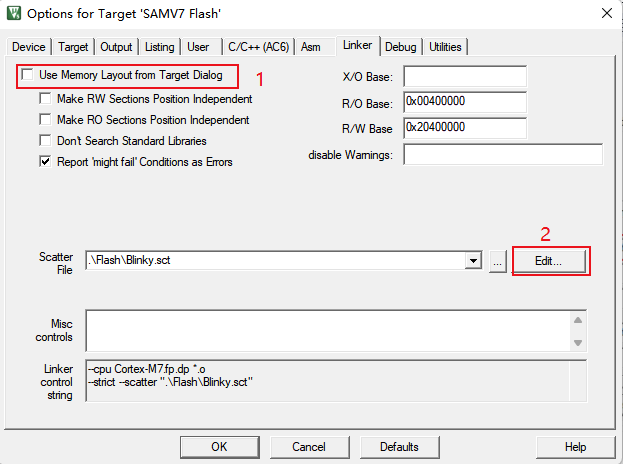 2)、然后,切換在Linker欄中。取消勾選Use Memory Layout from Target Dialog,讓μVision不根據Target和Properties對話框中提供的內存信息創建一個鏈接器分散文件。而由下面的Scatter Flies中去定義分散加載文件的內存劃分。點擊Edit...可以去編輯文件。(如圖4-2)