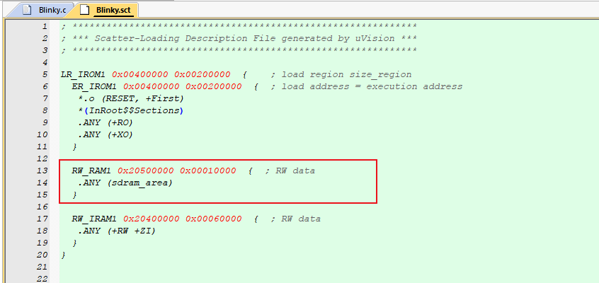 3)、在打開的分散加載文件中,去定義剛才在Target中規劃的內存地址。如圖4-3中的紅框處。將這個內存段用sdram_area字段來標識。