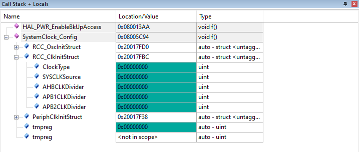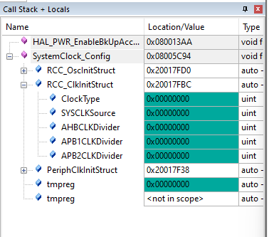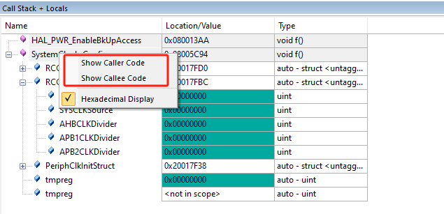 1)、在MDK Debug模式下,有一個Call Stack + Locals窗口,該窗口就是用于顯示當(dāng)前位于堆棧上的對象。對于使用RTX-RTOS的應(yīng)用程序,會顯示任務(wù)。每個對象都與其位置或值以及類型相關(guān)聯(lián)。當(dāng)前函數(shù)位于列表頂部,被調(diào)用函數(shù)位于其下方,并且還會顯示當(dāng)前函數(shù)的所有局部變量的信息。(如圖4-1)