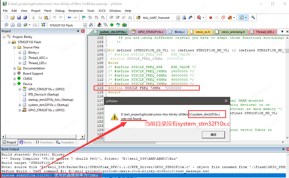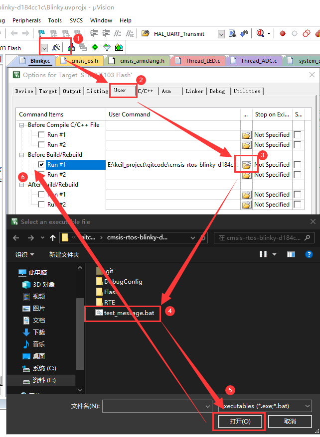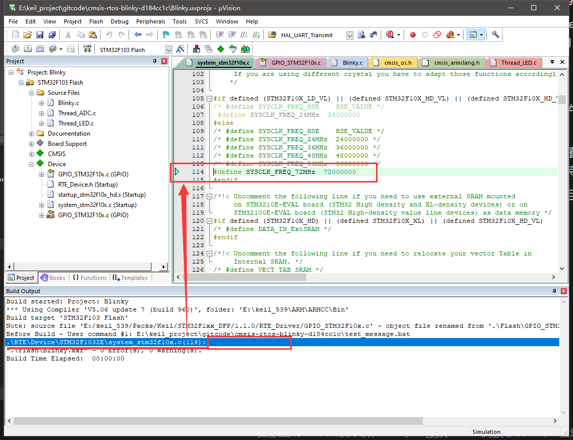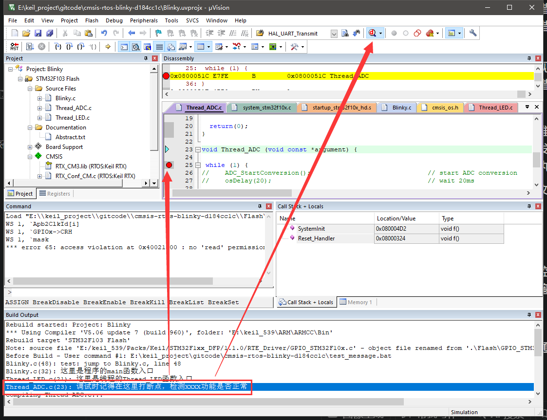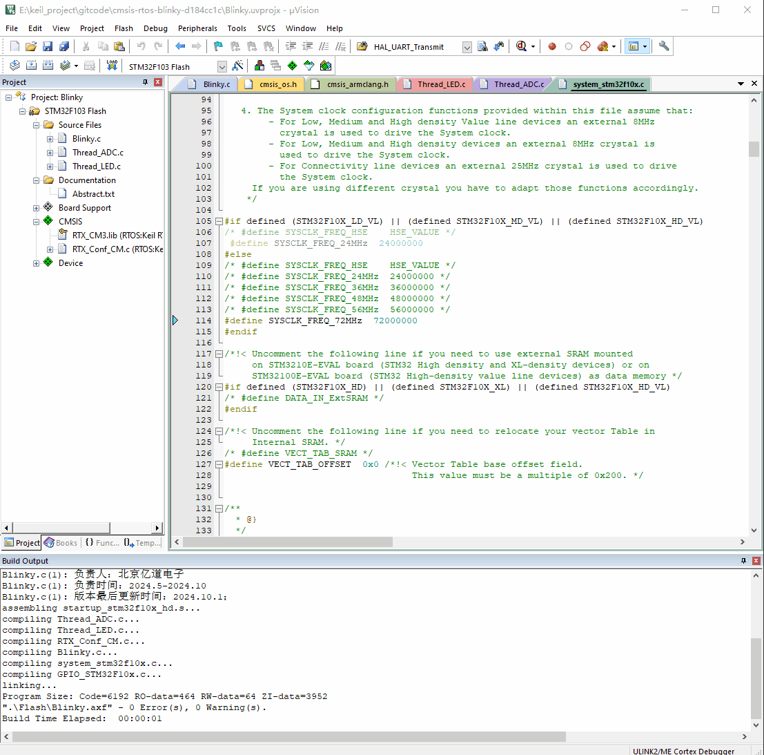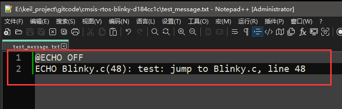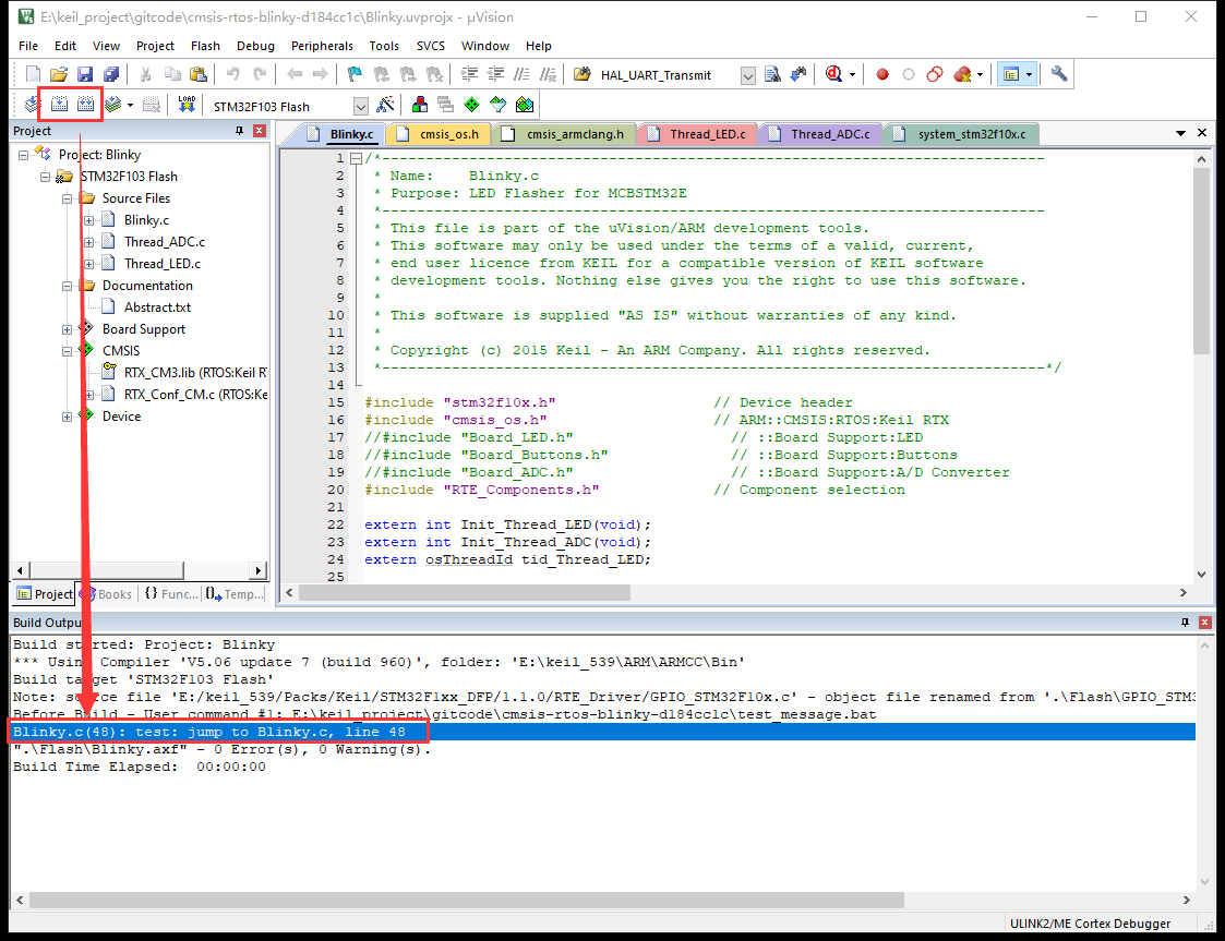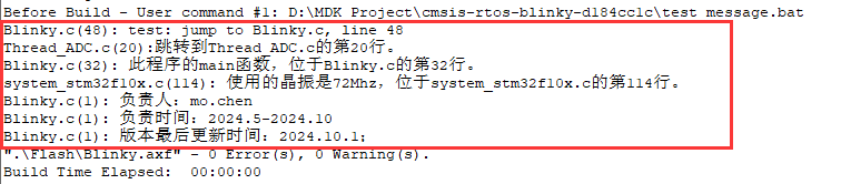 5)、添加完文件以后,需要我們點擊構建或者重構,都可以。構建完成后,即可看到我們在文件中定義的內容:ECHO Blinky.c(48): test: jump to Blinky.c, line 48