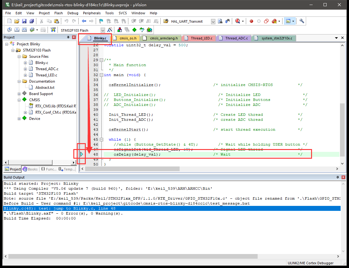 6)、接著我們雙擊出現的這一行指令,即可發現,我們的代碼界面,已然跳轉到了指定的Blinky.c文件的第48行,如圖7所示,此時這一行的輸出,已經具有了按鈕的特性!