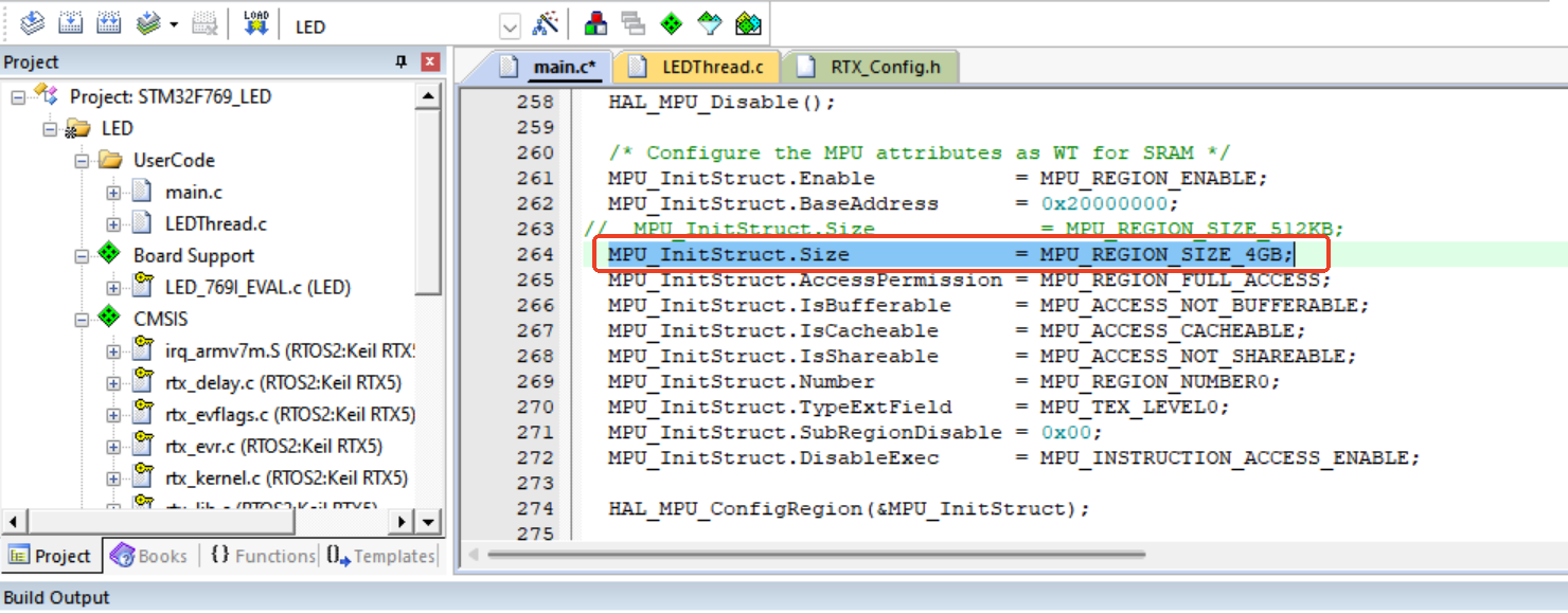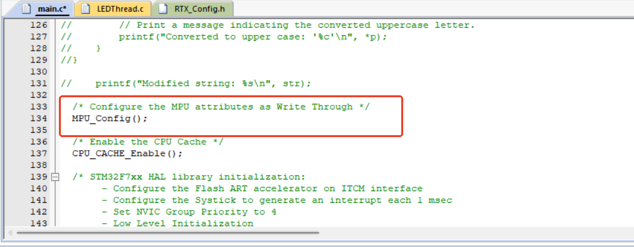 在Keil MDK中,用RTOS2后,在Main函數(shù)中開啟MPU初始化后,RTX5的線程無(wú)法正常啟動(dòng),如圖2-1所示: