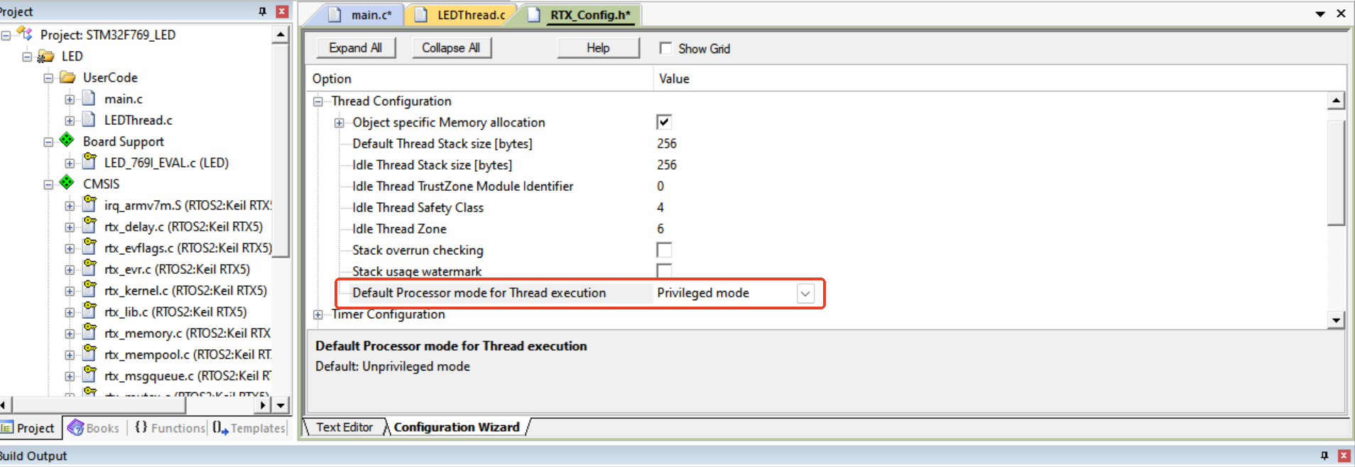 如果不修改“MPU_InitStruct.Size”的值,打開RTX的配置文件把默認(rèn)線程的模式修改為特權(quán)模式,如圖4-2所示: