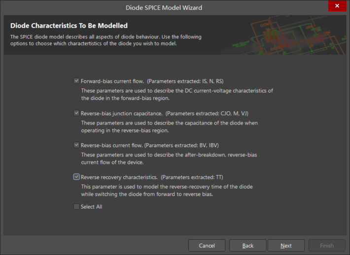 7. 單擊 Next 按鈕。如圖 6 所示,出現(xiàn) Diode Characteristics To Be Modelled(所建模二極管的特性)對話框。勾選以下所要創(chuàng)建的二極管模型特性根據(jù)數(shù)據(jù)手冊進(jìn)行填寫特性數(shù)據(jù)。