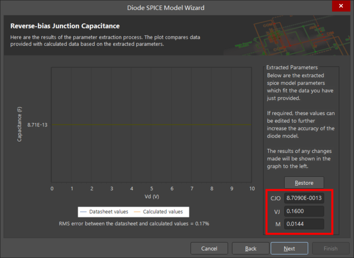 提取的參數(shù)(CJO、M、VJ)這些參數(shù)用于描述在反向偏置區(qū)域中操作時(shí)二極管的電容。