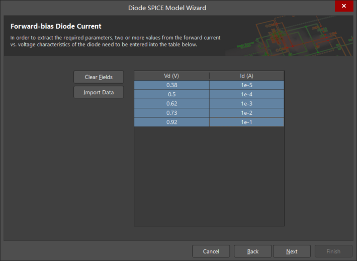 單擊 Next 按鈕。如圖 7 所示,出現(xiàn) Forward-bias Diode Current(正向偏置的二極管電流)設(shè)置對話框,參照數(shù)據(jù)手冊填寫正向偏置的二極管電流設(shè)置對話框,按圖輸入Vd-Id的對應(yīng)關(guān)系。