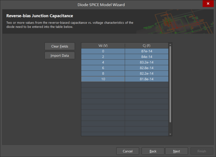 單擊 Next 按鈕。如圖 9 所示,出現(xiàn) Reverse-bias Junction Capacitance(反向偏置結(jié)電容)設(shè)置對話框。按照 1N4148 手冊所示,輸入 Vd-Cj 的關(guān)系。