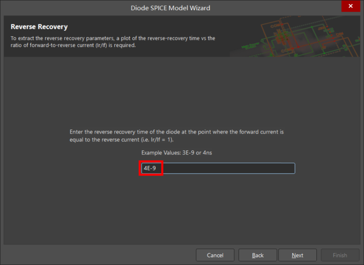 Enter the reverse recovery time of the diode at the point where the forward current is equal to the reverse current(輸入在正偏電流和反偏電流相等點(diǎn),即 Ir=If 的反向恢復(fù)時(shí)間):4E-9。