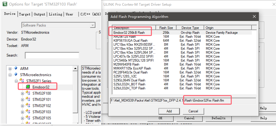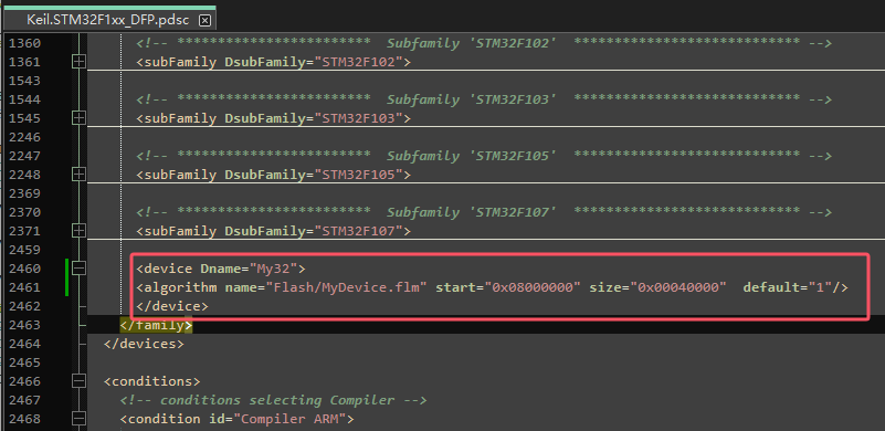 (11)、在 PDSC 文件中,我們可以看到所有 F1 系列芯片的 Flash 燒寫算法文件,我們如果想要添加一個自己的芯片進去,就可以在如圖 14 這里,添加并命名我們的設備,附上對應的 FLM 文件,即可在 keil 軟件重啟后,看到我們添加的芯片了,對應的,也可以找到我們這個芯片的 Flash 編程算法了,如圖 15 所示: