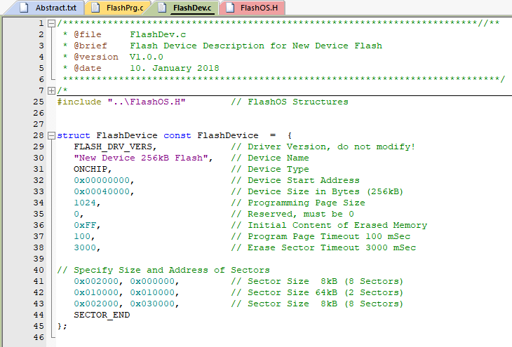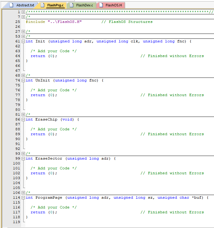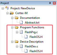 在這個 C 文件里,需要我們包含一些必需的 Flash 編程函數:Init, UnInit, EraseSector, 和 ProgramPage. 然后除了這些必需函數,可以根據設備功能(或為了加快執行速度),可以實現 EraseChip、BlankCheck 和 Verify 功能。