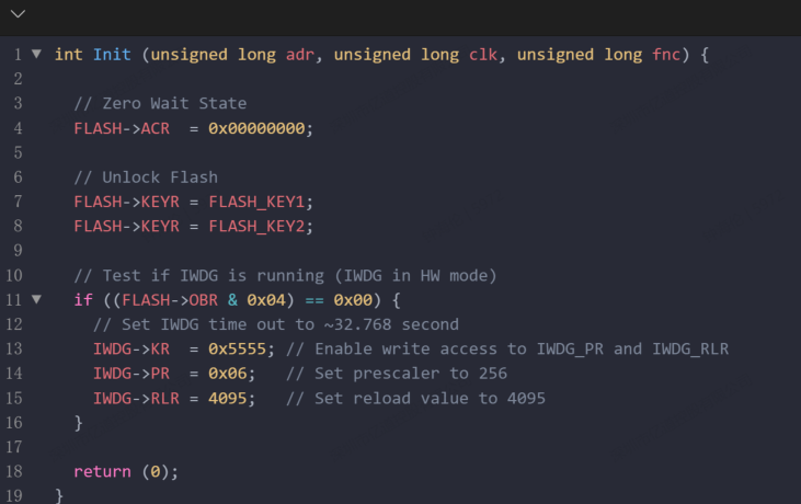 第 15 行: IWDG->RLR = 4095; // Set reload value to 4095