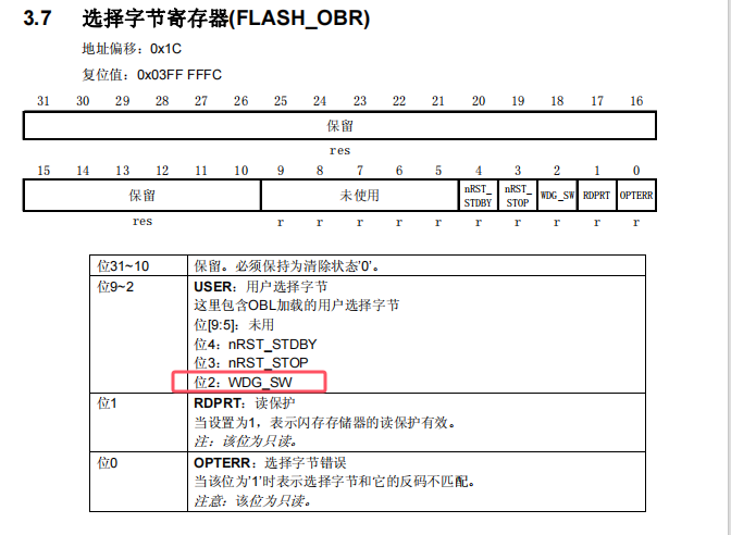 FLASH->OBR 是 Flash 的選項字節寄存器(Option Byte Register),其中位 2 用于指示獨立看門狗(IWDG)的運行模式: