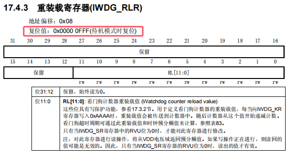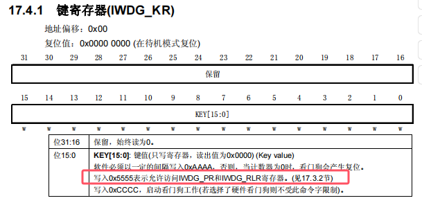 IWDG->KR 寫入 0x5555,是表示允許對 IWDG 的預分頻寄存器(IWDG_PR)和重裝載寄存器(IWDG_RLR)進行寫操作。如圖 18 所示: