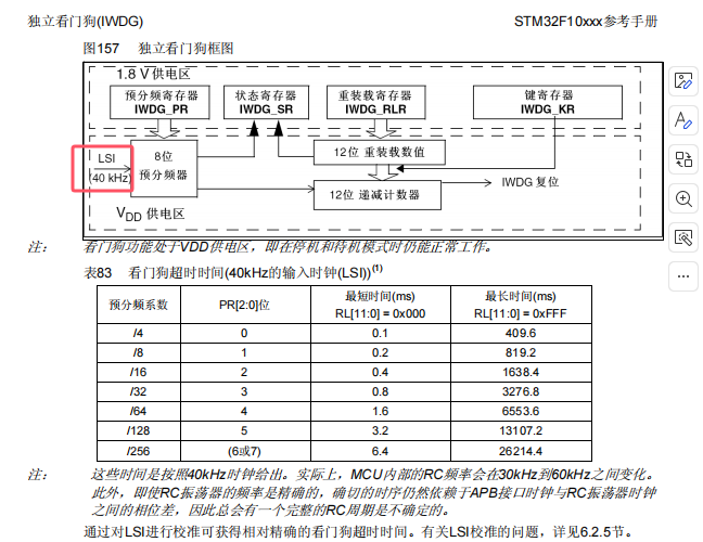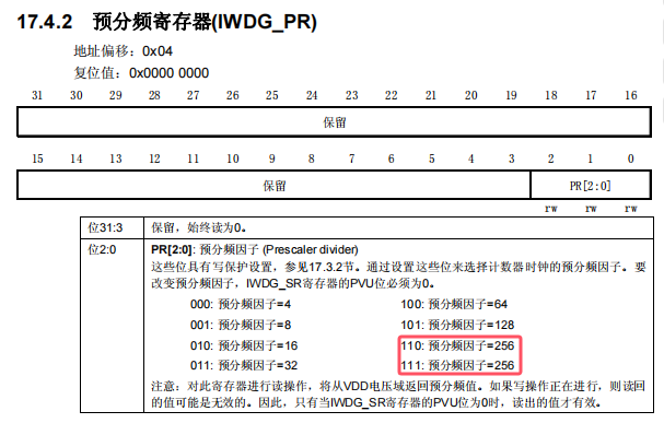 IWDG->PR 寫入 0x06 是為了配置預分頻器值為 256(分頻系數為 2^8),將時鐘周期放大到較低的頻率。如圖 19 所示。
