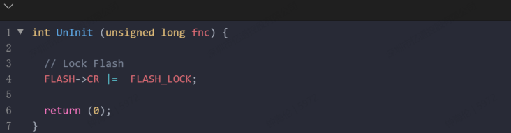反初始化,它的實現很簡單,主要完成以下任務:FLASH->CR |= FLASH_LOCK,其實就是鎖定 Flash 模塊,因為 FLASH_LOCK 是 Flash 控制寄存器(FLASH->CR)中的一個位,它的作用是鎖定 Flash 模塊,以防止未經授權的寫操作。在鎖定狀態下,Flash 不允許進行寫操作(如擦除或編程),只能進行讀取操作。如圖 22 所示:
