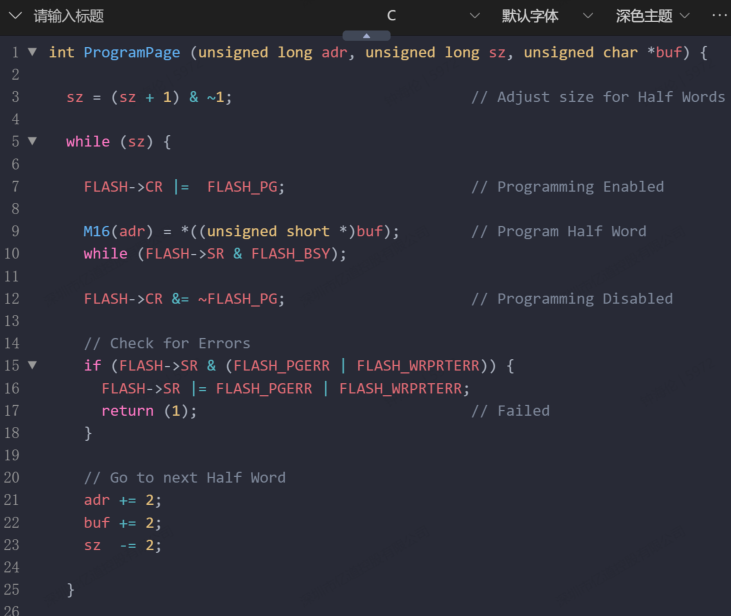 Flash 的編程單元是 半字(16 位,2 字節),因此寫入的大小 sz 必須是偶數。如果輸入的大小是奇數,通過 (sz + 1) & ~1 向上對齊為偶數。