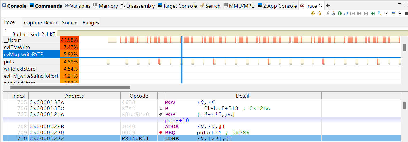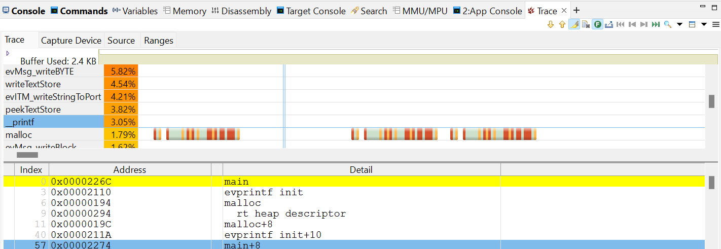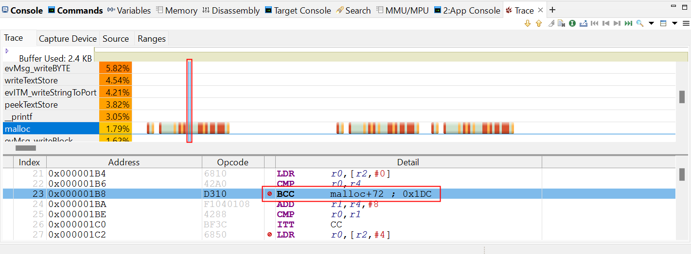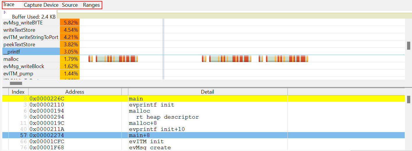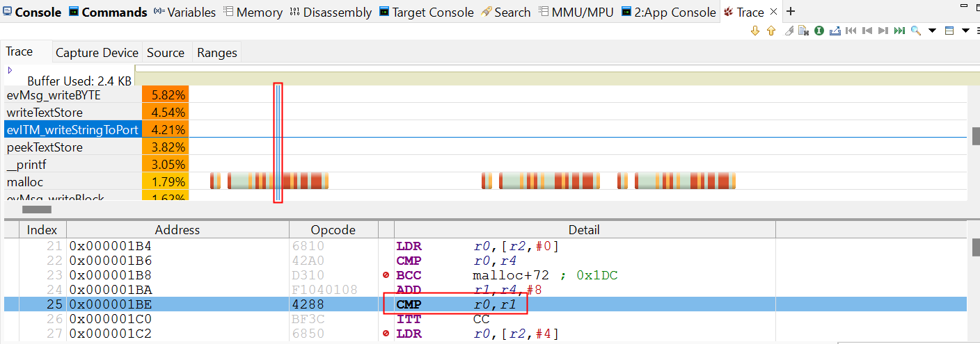 ● Trace標簽頁顯示圖形時間線和反匯編代碼。