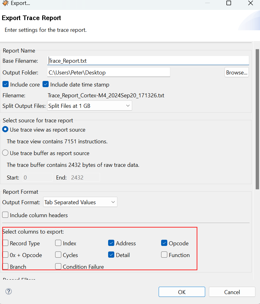 5. 導出的Trace數(shù)據文件是一個文本文件,默認情況下文件的內容與Trace視圖導航圖下部分的內容相同;導出Trace窗體中可以對導出的Trace數(shù)據進行設置,如圖3-7所示: