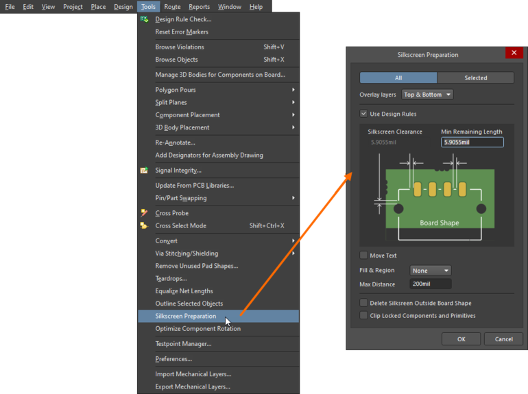 菜單欄下打開:【Tools】→【Silkscreen Preparation】,將絲印制備對話框打開。