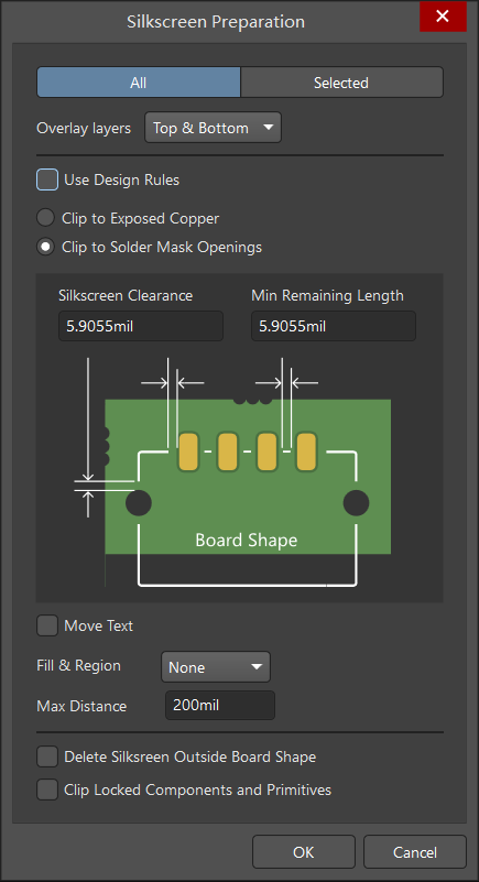 第一欄:設置即是將絲印制備適用于哪些元素對象的選擇,【All】選項為所有對象,【Selected】選項為僅在設計中選擇的對象,此處一般默認【All】適用于所有對象設置。