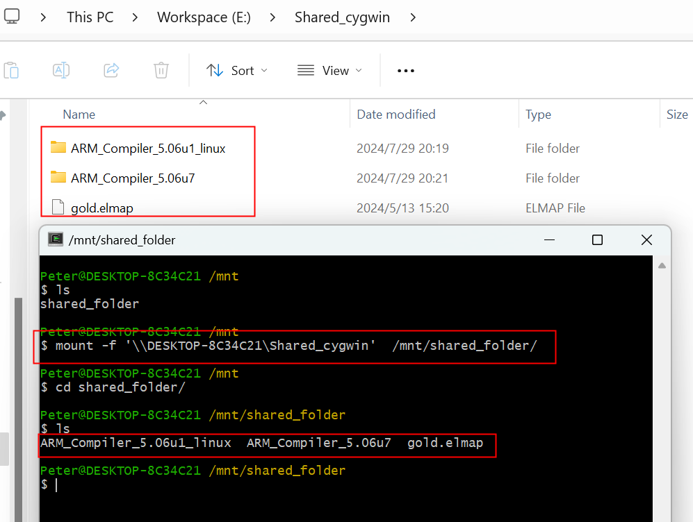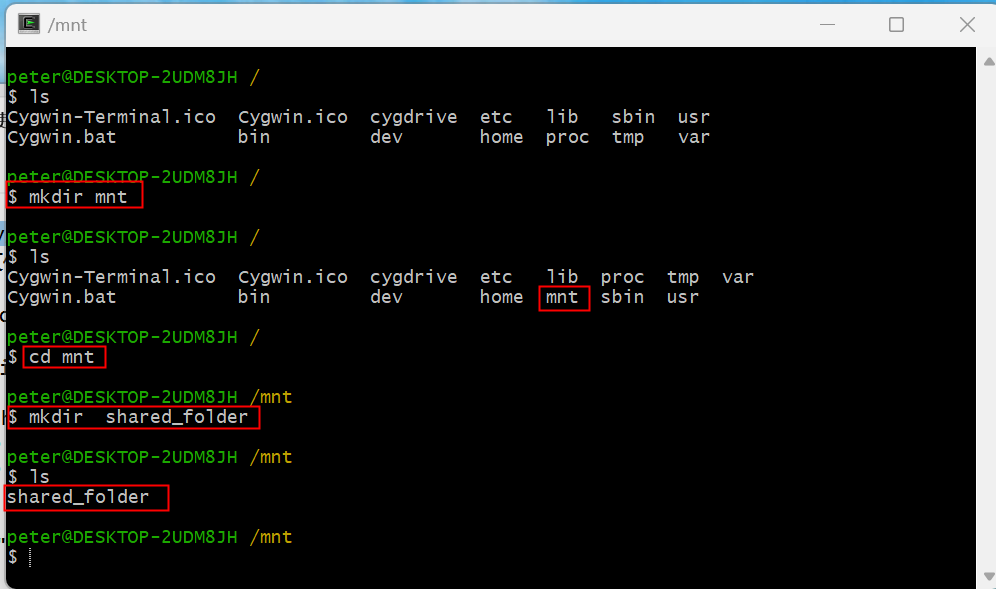 5. 通過(guò)輸入“ mount -f '\DESKTOP-2UDM8JHShared_cygwin' /mnt/shared_folder/“命令把Windows下的共享目錄”Shared_cygwin“掛載到Cygwin的”/mnt/shared_folder/“目錄下,以后就可以通過(guò)Windows下的共享目錄”Shared_cygwin來(lái)實(shí)現(xiàn)Windows與Cygwin之間的文件傳輸,如圖3-5所示: