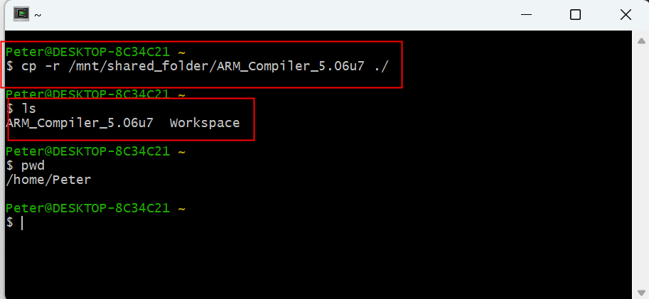 6. 把Windows版本的ARM編譯器復(fù)制到“/home/Peter”目錄下,并創(chuàng)建一個(gè)“Workspace”目錄,如圖3-6所示:(注:Cygwin下無(wú)法識(shí)別Linux版本的ARM編譯器)