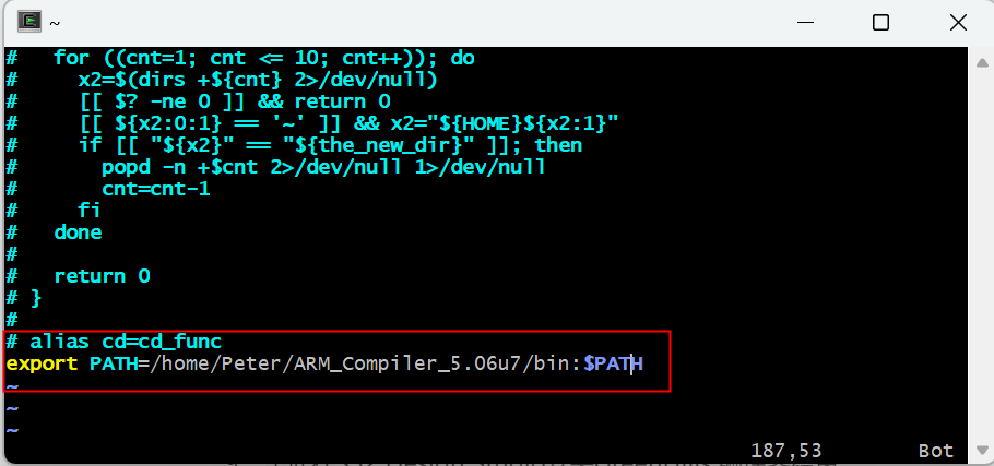 8. 配置一下“/home/Peter”目錄的“.bashrc”文件,添加ARM編譯器的路徑,如圖3-8所示: