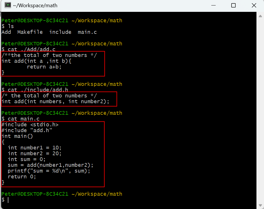 1. 在“Workspace”目錄下創(chuàng)建math目錄,再創(chuàng)建兩個(gè)子目錄:Add與include,并創(chuàng)建對(duì)應(yīng)的源代碼文件,如圖4-1所示: