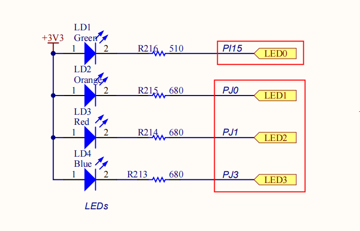 1. STM32F769開發(fā)板上LED燈的原理圖如圖3-1所示: