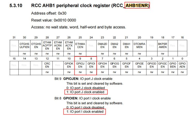 3. 使能GPIOI與GPIOJ的時鐘:“__setbit(RCC->AHB1ENR, 8); __setbit(RCC->AHB1ENR, 9);”這樣設(shè)置的依據(jù)如圖3-2所示:
