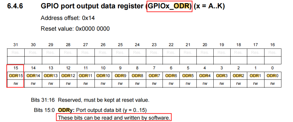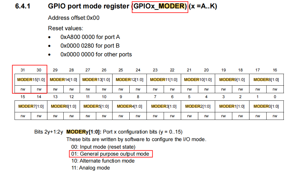4. 配置GPIOI_15引腳的模式為輸出模式:“__setbit(GPIOI->MODER, 30);__clearbit(GPIOI->MODER, 31);”,設(shè)置的依據(jù)如圖3-3所示: