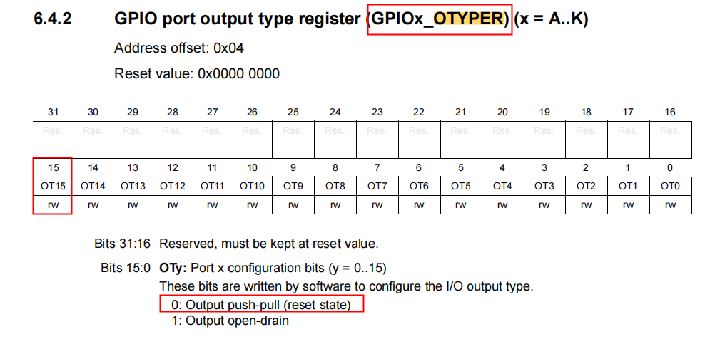5. 配置GPIOI_15引腳的輸出類型為Push-Pull:“__clearbit(GPIOI->OTYPER, 15);”設(shè)置的依據(jù)如圖3-4所示: