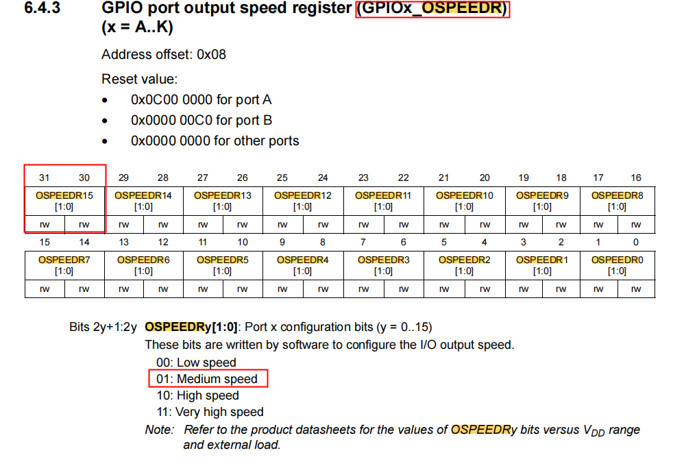 6. 配置GPIOI_15引腳的速度為中速:“__setbit(GPIOI->OSPEEDR, 30);__clearbit(GPIOI->OSPEEDR, 31);”,設(shè)置的依據(jù)如圖3-5所示: