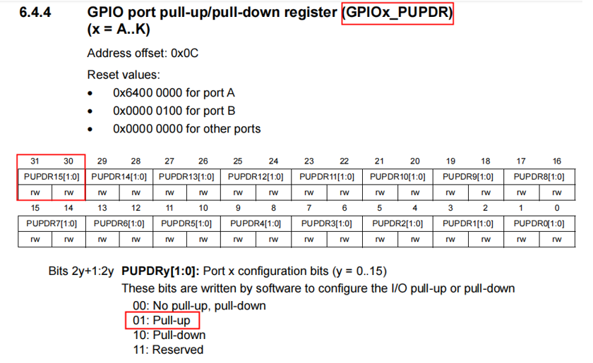 7. 配置GPIOI_15引腳為上拉電阻:“__setbit(GPIOI->PUPDR, 30);__clearbit(GPIOI->PUPDR, 31);”設(shè)置的依據(jù)如圖3-6所示: