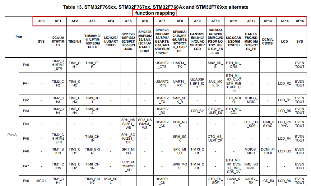 (1)、先查看復(fù)用功能寄存器的功能Map表,找到需設(shè)置的引腳數(shù),確認(rèn)復(fù)用功能,如圖5-1所示: