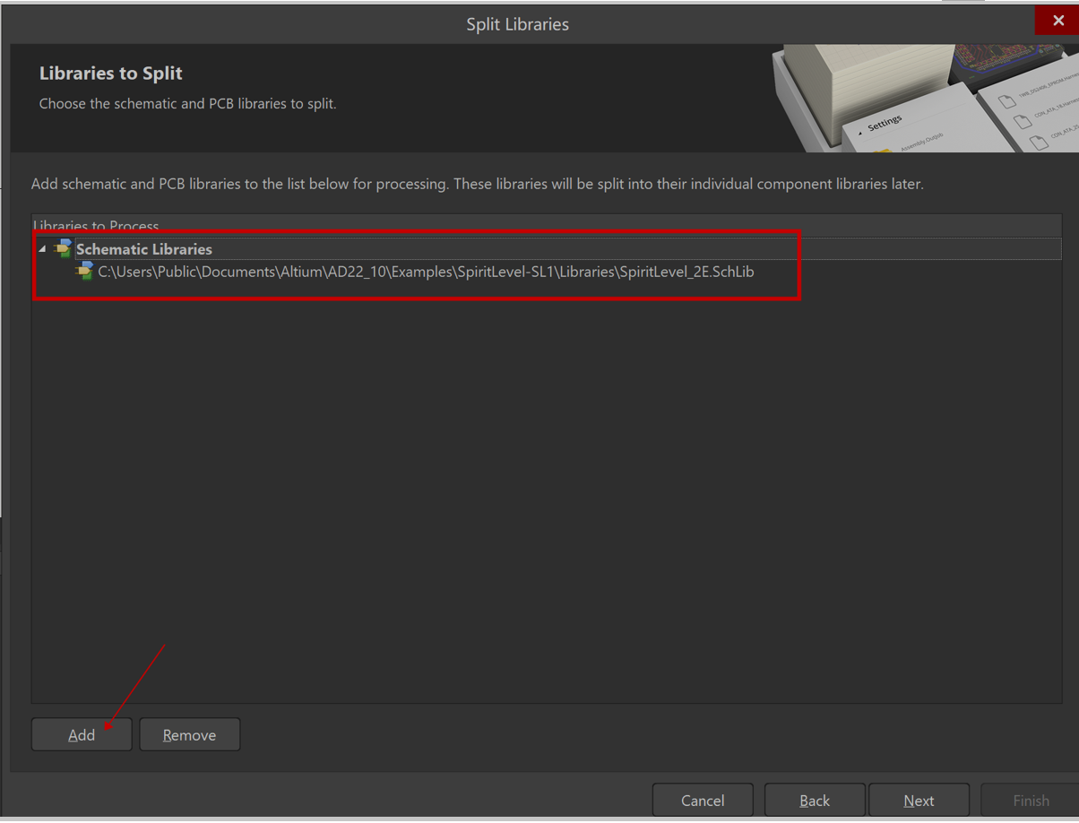 2)、點擊Add添加需要拆分的原理圖符號庫文件,點擊Next進入下一步。