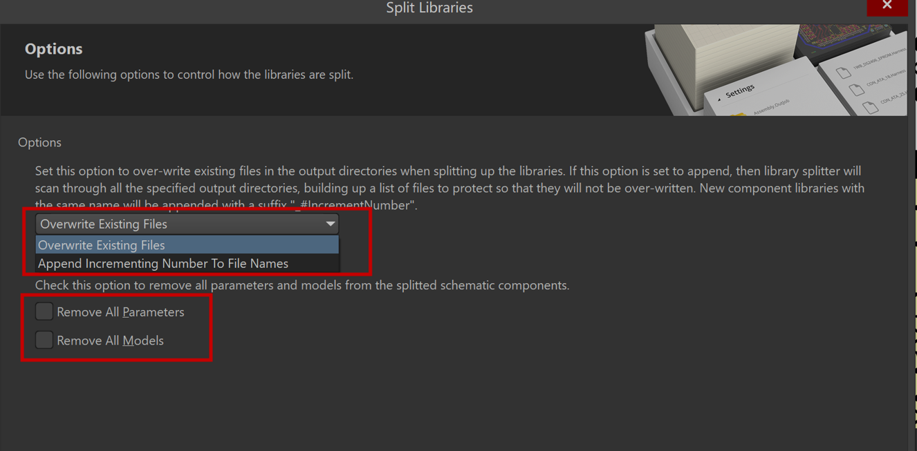 4)、選擇是否覆蓋已經(jīng)存在的文件,拆分后的庫文件將會以每個模型自身的名字為文件名,Overwrite Existing Files將會覆蓋保存路徑下已存在的相同的庫文件。如果不想覆蓋,請選擇Append Incrementing Number To File Names,遇到相同的文件名,會自動添加“_數(shù)字”為后綴以作區(qū)分。