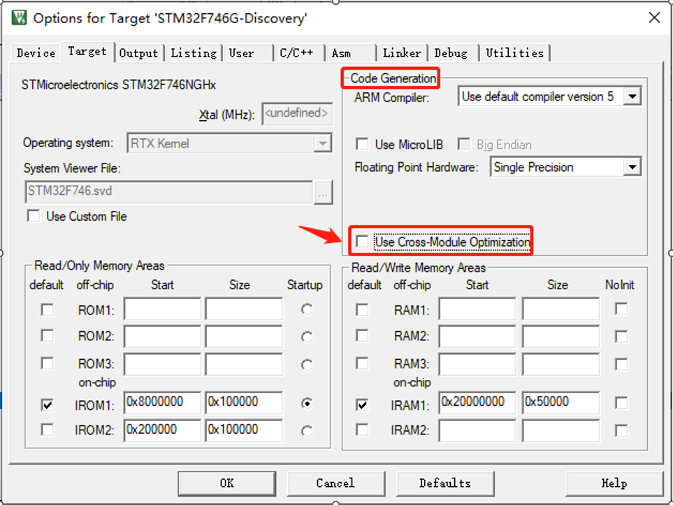3、在“Code Generation”下的“Use Cross-Module Optimization”前面的復選框進行取消勾選,然后點擊OK確認。