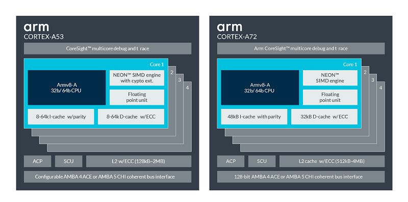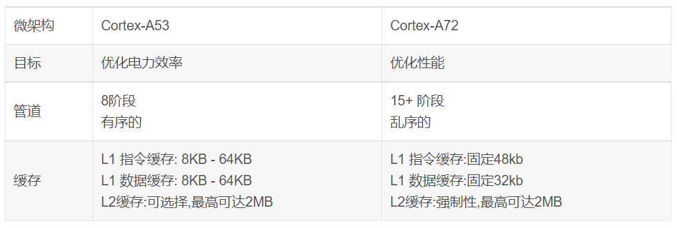 例如,Cortex-A53和Cortex-A72都是Armv8-A架構(gòu)的實(shí)現(xiàn)。這意味著它們具有相同的架構(gòu),但它們具有不同的微架構(gòu)。如下圖和表所示: