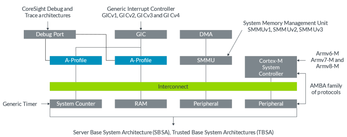 ARM架構是最有名的ARM規(guī)范,但它并不是只有這些。ARM對于構成現(xiàn)代系統(tǒng)芯片的許多部件都有類似的規(guī)范。