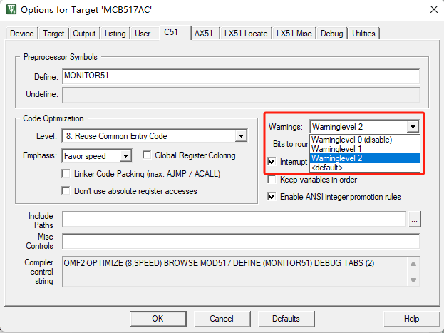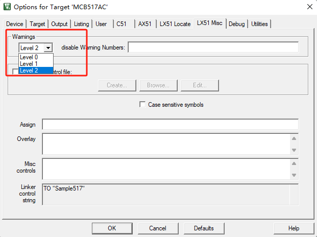 (注意:這個鏈接器的警告控制是針對于LX51鏈接器,對于BL51鏈接器沒有警告等級控制)