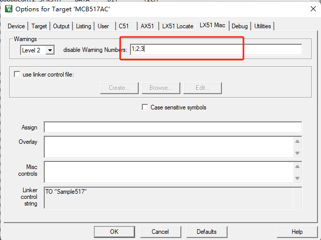 4)、在LX51 Misc中還可以將指定的警告信息進行屏蔽,將工程師認為不會影響功能實現的警告信息進行直接屏蔽,如圖4-4所示。