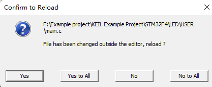 目前越來越多第三方編輯器在代碼編寫、代碼自動補全、代碼模板上的功能越來越強大,很多工程師都開始愿意在第三方編輯器上面去編寫代碼,從而加快代碼的編寫速度和代碼規范。然后,回到MDK中去構建代碼。但是,回到MDK中會提示文件被修改,是否進行加載(如圖2-1)。