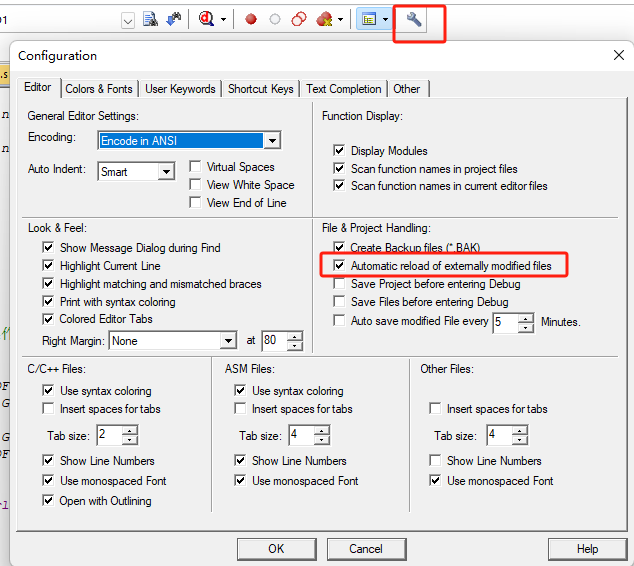 1)、在Configuration窗口中,切換到Editor欄中,可以在File&Project Handing中勾選上“Automatic reload of externally modified files ”(如圖4-1)。開啟這個選項后,就可以在第三方編輯器中修改完代碼后,回到MDK就會自動重新加載文件,不需要再次確認。