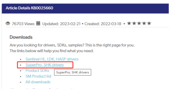 2、解決方法就是在加密狗的驅(qū)動(dòng)官網(wǎng)下載 https://supportportal.thalesgroup.com/csm/?id=sentinel 在網(wǎng)頁(yè)上找到 Drivers and_Downloads-> SuperPro, SHK drivers (如圖4-2-1和圖4-2-2),然后下載Sentinel Protection Installer Version 7.5.0 (Installer Only)這個(gè)版本的驅(qū)動(dòng)程序進(jìn)行安裝。